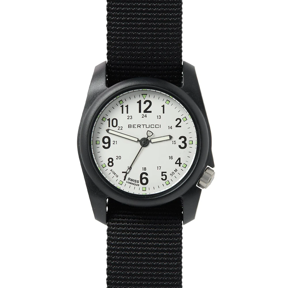 ๐๐๐๐๐๐๐๐ ๐๐๐๐: Bertucci quartz watches are made of titanium case and black nylon strap. Its three hands are also made from the same material to maintain the quality of the product.